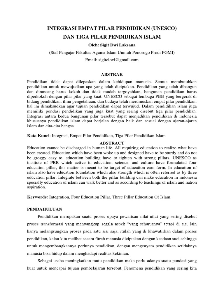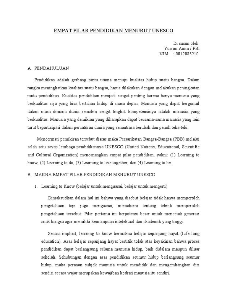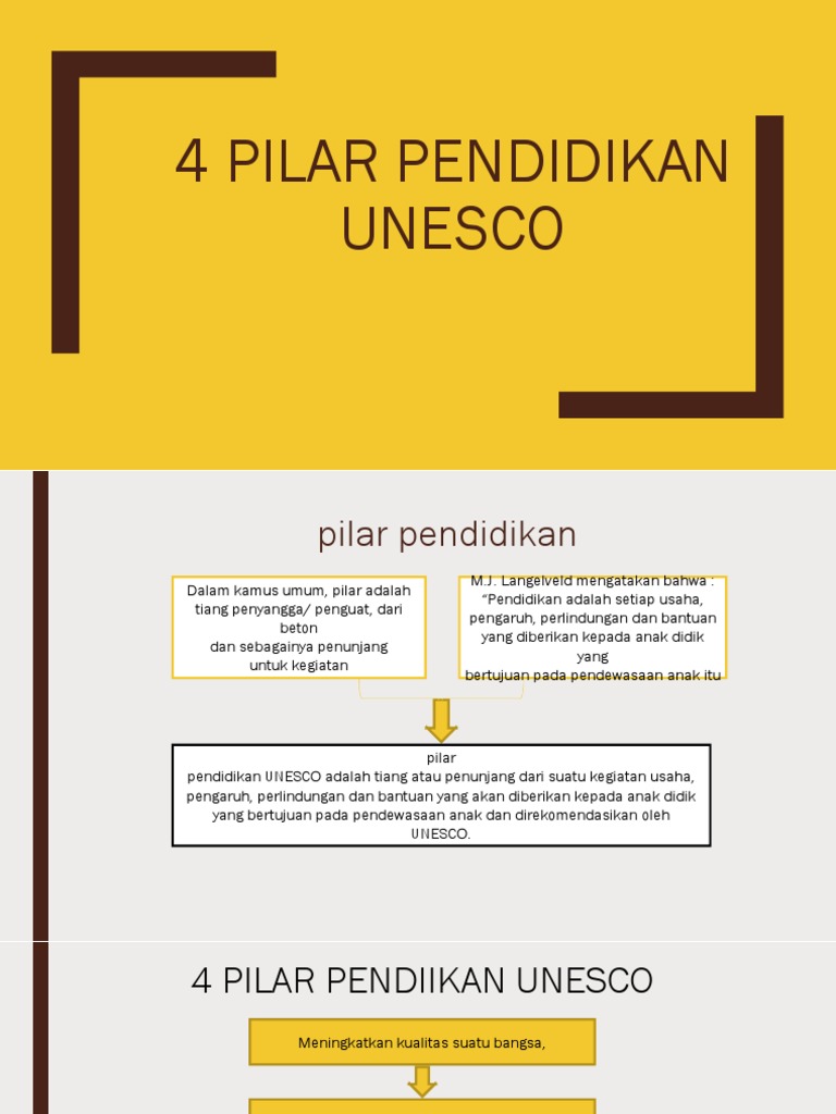 Implementasi empat pilar pendidikan seperti yang dicanangkan unesco ini dapat dilihat dalam konsideran yang melandasi peraturan pemerintah nomor 19 tahun 2005 tentang standar nasional. Menjelaskan hakekat belajar sepanjang hayat. Dalam kamus besar bahasa indonesia, kata pilar diartikan sebagaitiang penyangga. Unesco ini merupakan singkatan dari united nations educational, scientific and cultural organization. Salah satu indikator kualitas kesejahteraan suatu bangsa, ditentukan oleh pendidikan, karenanya arah kebijakan pendidikan suatu bangsa menunjukan arah kesejahteraan yang ingin dicapai bangsa.